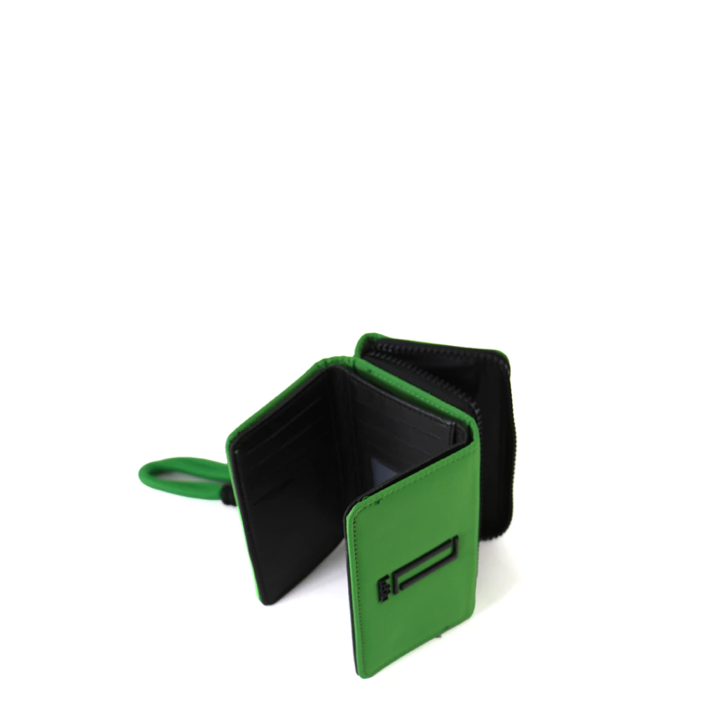 Con medidas de 9 cm de alto, 14 cm de ancho y 3 cm de profundidad, es perfecta para llevar con comodidad sin ocupar espacio. Además, incluye una correa para muñeca que facilita su transporte y un porta tarjetas integrado para mantener todo organizado y al alcance.